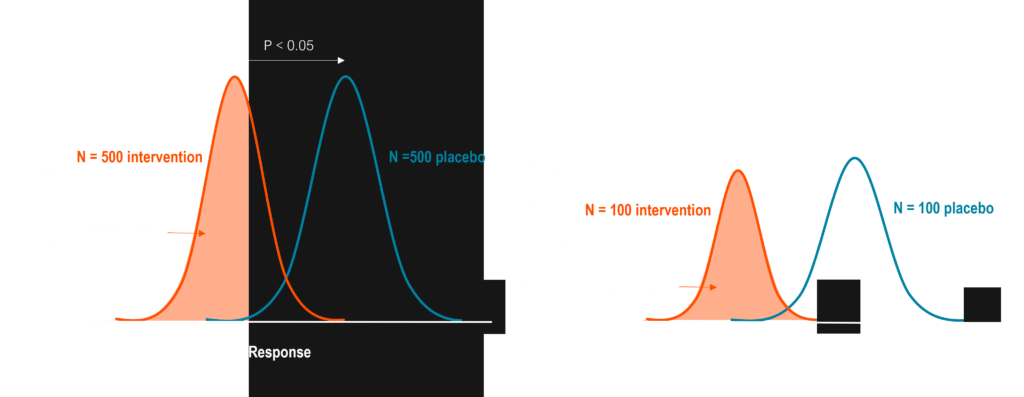 Now, if we enrich the same trial by enrolling only patients that have a biomarker indicating they are likely to respond to the drug therapy, we can significantly lower the overall trial size while at the same time demonstrate maximum benefits for the intervention group.