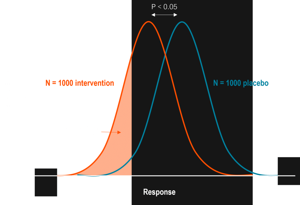Why are large, expensive clinical trials so common? It stems from the challenge of needing to demonstrate treatment efficacy in enough of the patient population despite the fact that a majority of patients are likely to be non-responders. The FDA generally expects at least 35% of patients in a trial to be “responders” in order to advance the drug program to approval, but even that percentage is often difficult to attain.